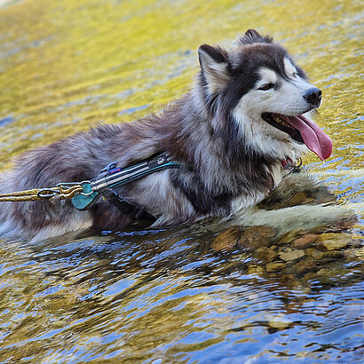Nicht alle nordischen Hunde schwimmen – ihre dichte Unterwolle kann im Wasser zur Gefahr werden. Deshalb begleiten uns nur erfahrene „Wasserratten“ aus unserem Rudel, die das Schwimmen lieben und es genießen, gemeinsam mit Ihnen durchs Wasser zu ziehen.